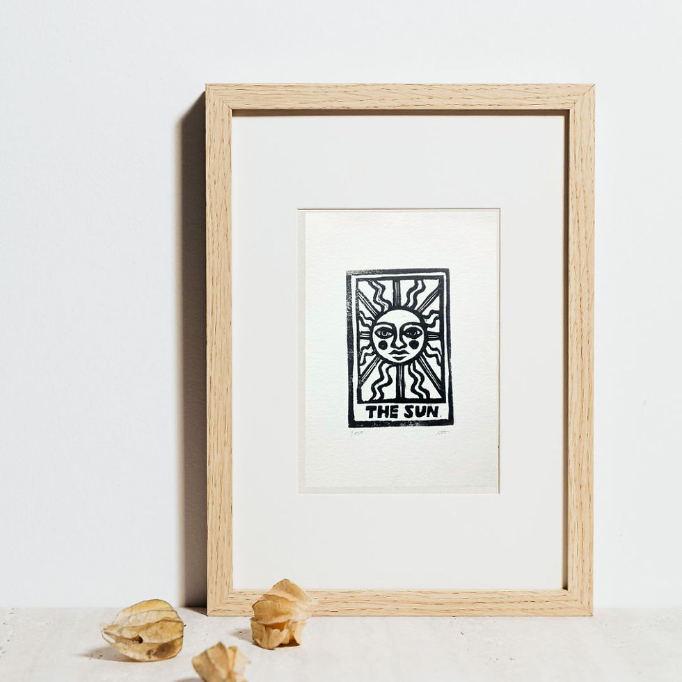 Hand illustrated digital art print featuring a a cactus/hand and a red/orange sun, illustrated by Nina Lubarsky. Some texture comes from the paper choice while other texture is digitally printed on the design.